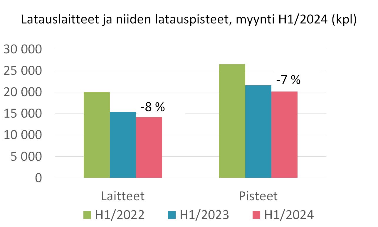 Toisen vuosineljänneksen laitemyynti jäi viime vuoden vastaavasta jaksosta enää vain neljä prosenttia. Myytyjen laitteiden sisältämien latauspisteiden määrä jopa kasvoi 2,4 prosenttia, mikä johtui poikkeuksellisen suuresta Schuko- tai CEE-pistorasialla varustettujen hidaslatauslaitteiden myynnistä ajanjaksolla.