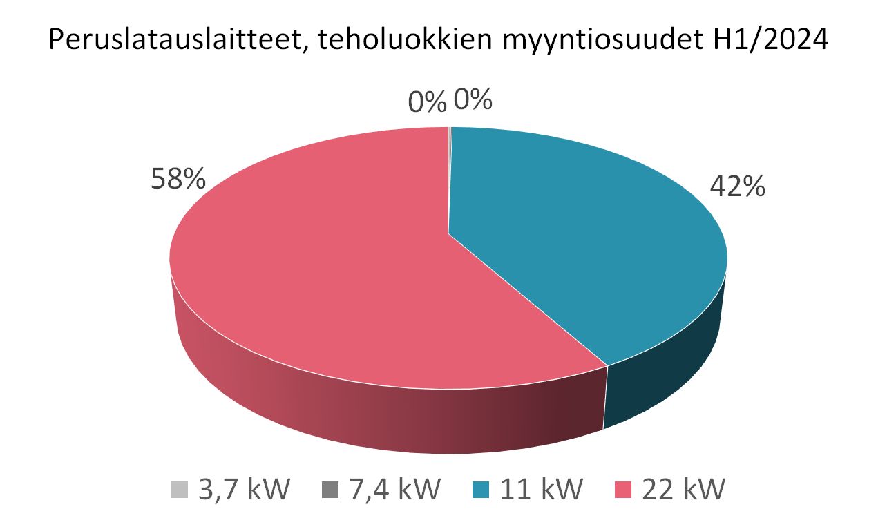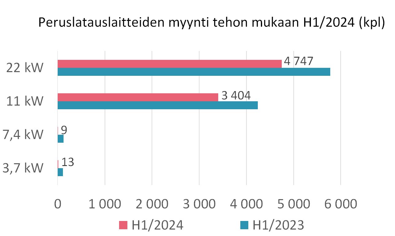 Peruslatauslaitteiden kysyntä keskittyy kahteen suurimpaan teholuokkaan. Niistä 22 kW laitteita myytiin alkuvuonna 4747 kappaletta ja 11 kW laitteita 3404.