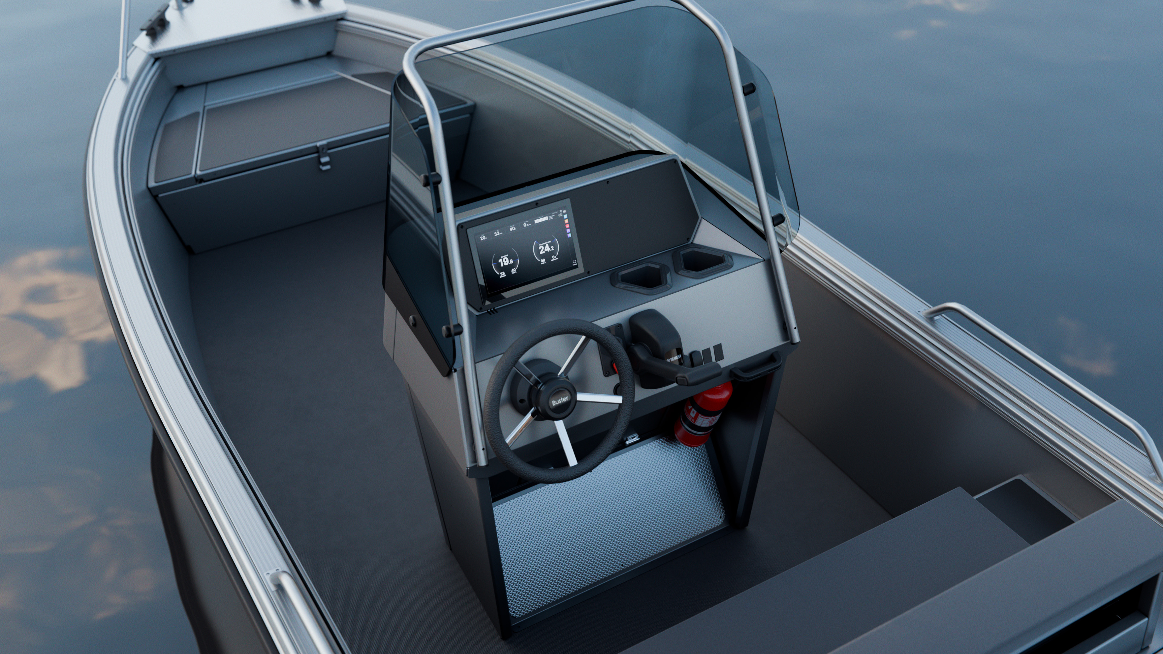 Väljästi muotoillussa konsolissa on paikka lisävarusteena saatavalle 10" Buster Q -älynäytölle. Tilaa on myös kahden lisänäytön sijoittamiseen huonontamatta näkyvyyttä eteenpäin. Lisävarusteita voi tarvittaessa kiinnittää myös tuulilasia kiertävään kaiteeseen.
