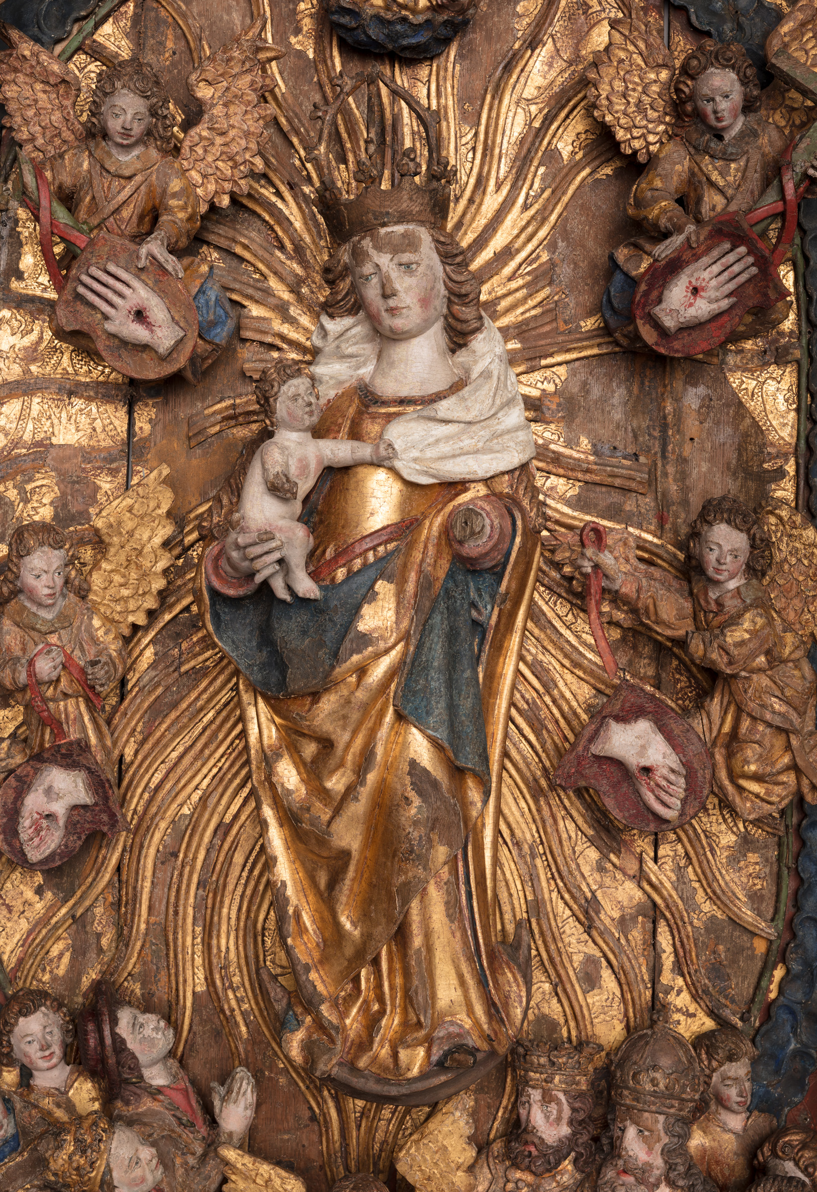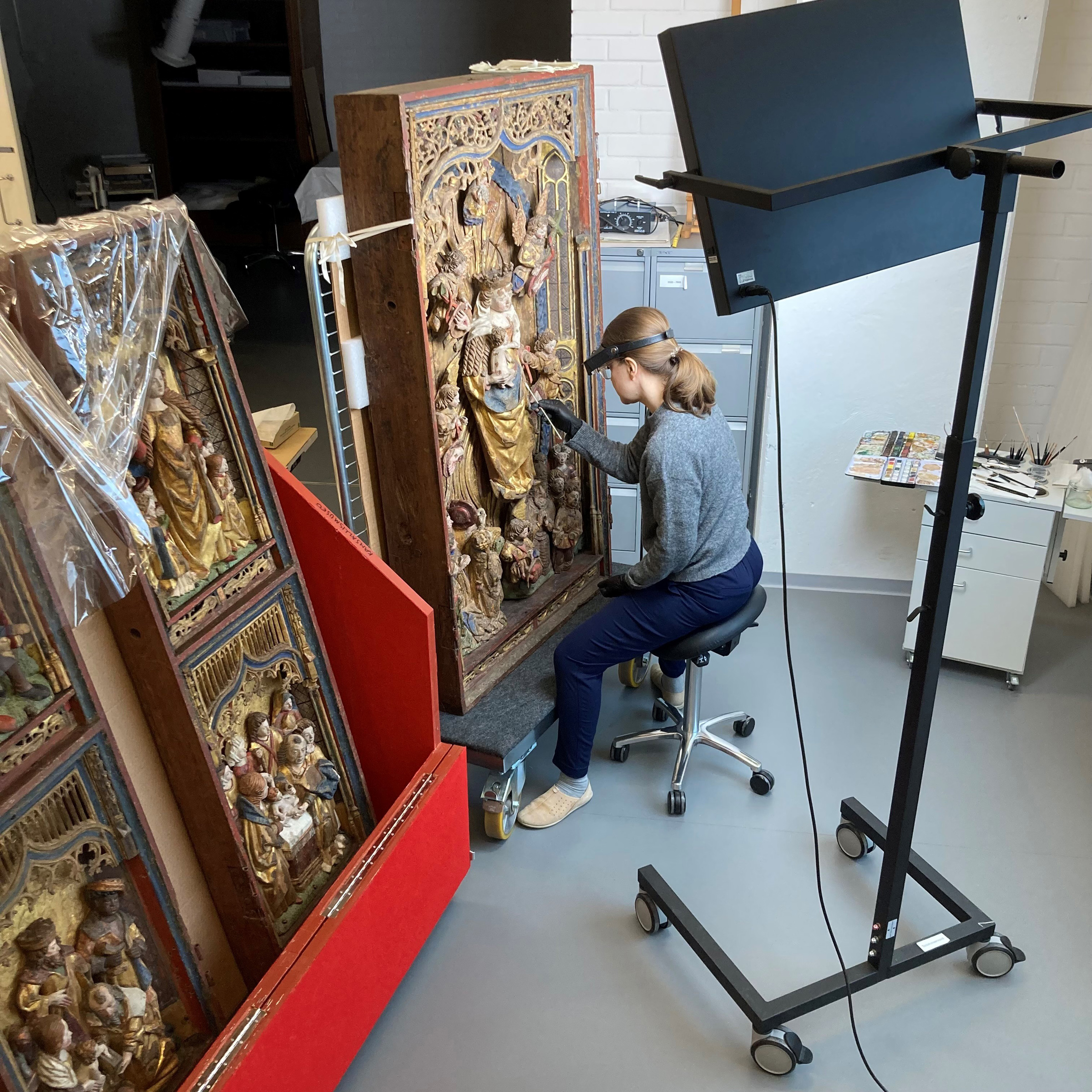 Alkuperäisen väriloiston palauttamiseksi kaksi konservaattoria puhdisti ja restauroi alttarikaappia kuukausia. Likakerrosten alta paljastunut kullan kiilto on voimakas ja värimaailma keskiaikaiselle taiteelle tyypillisesti melko kirkas.