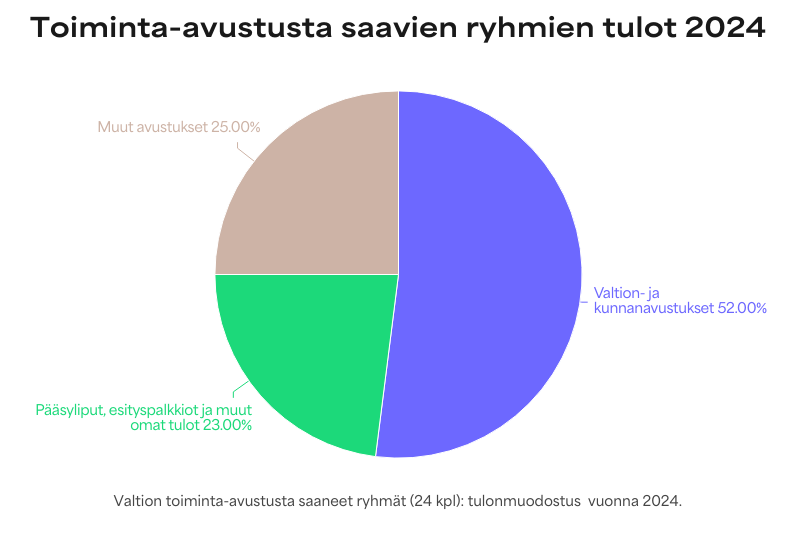 Noin puolet näiden ryhmien rahoituksesta tulee valtionavustuksena ja toinen puolikas hankitaan lipputuloina, esityspalkkioina, muina omina tuottoina sekä hakemalla muita avustuksia sekä yksityiseltä että julkiselta sektorilta. (Kuva 2)
