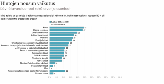 Korut, ulkona syöminen sekä urheilu- ja kulttuuritapahtumat olisivat ensimmäisiä säästökohteita, mikäli hinnat nousisivat 10 %. Vain 4 % vastaajista säästäisi elintarvikkeiden hankinnoista. Kyselyyn vastanneista 22 % arvioi, ettei hintojen nousulla olisi vaikutusta omaan ostoskäyttäytymiseen.