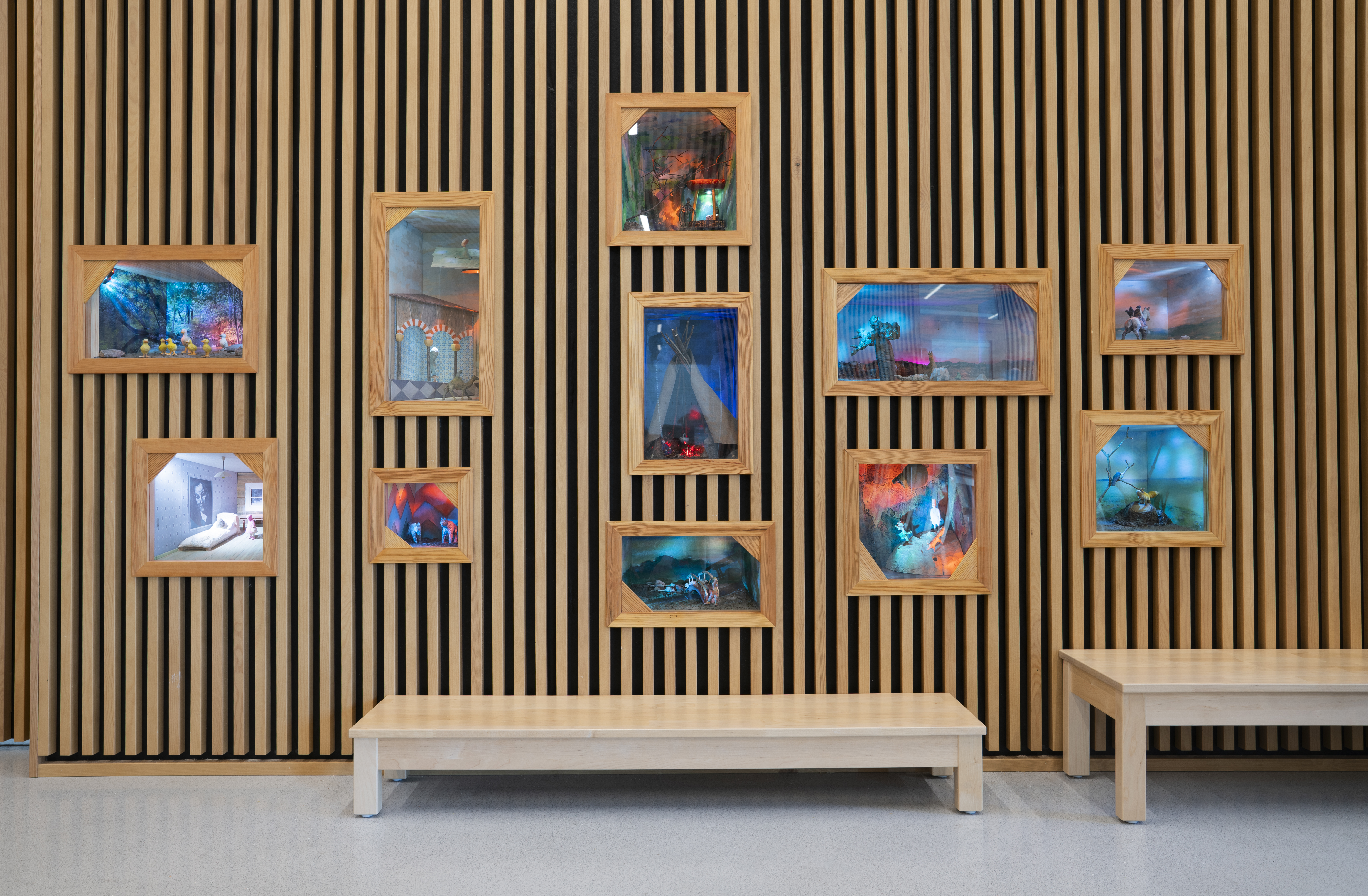 Jussi Valtakari and Antti Ylönen’s series ‘Once upon a time...’ fills the lobby walls at Daycare Aurinkokallio in Kannelmäki. The artwork features dioramas of different sizes, inspired by fairytales collected from around the world.