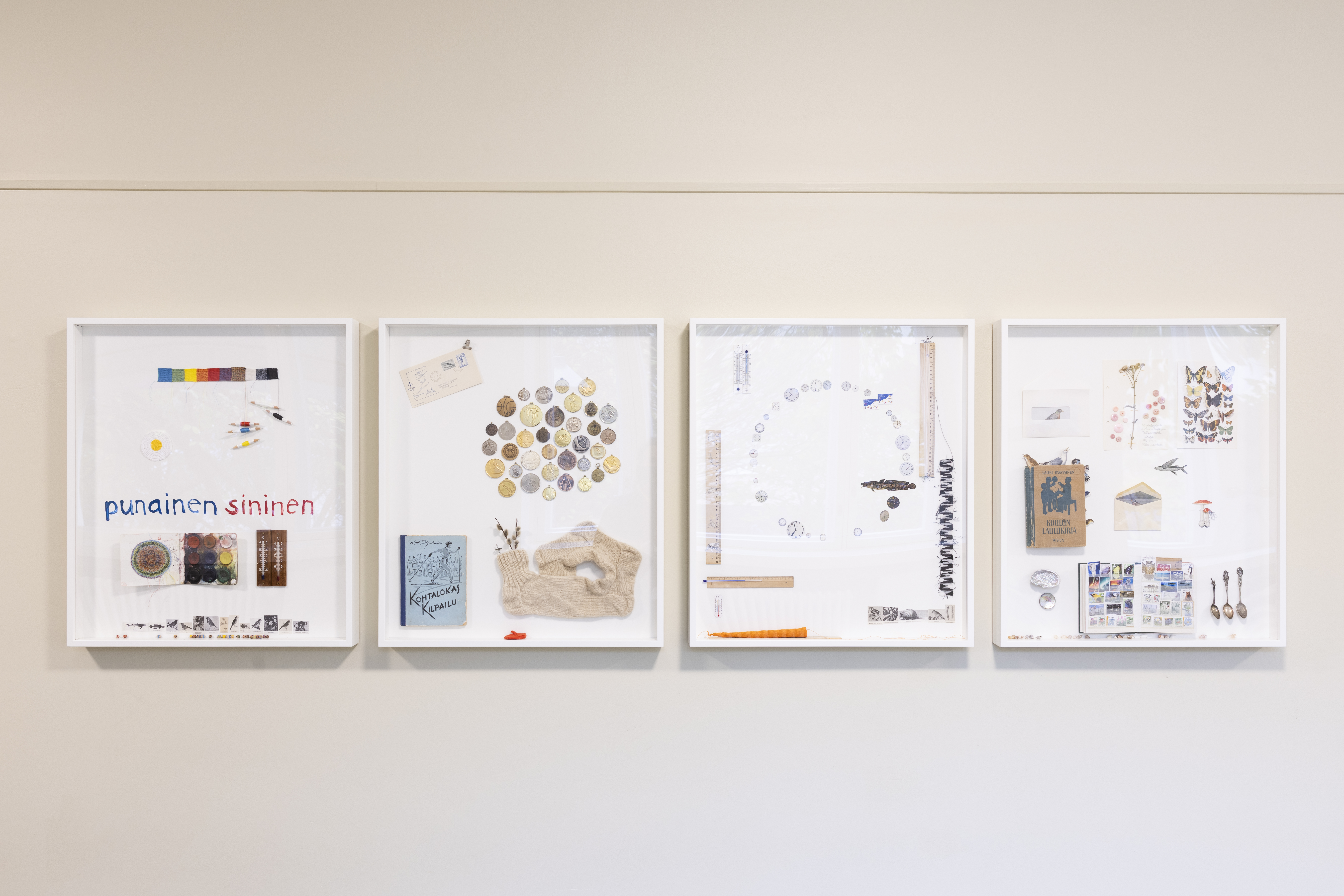 The series Educational Boards comprises four pieces. These assemblages invite viewers to study colour theory, visit ski tracks, calculate ‘maths’ and explore nature. In each framed artwork school children can discover a multitude on small observations on colour, movement, counting and nature.