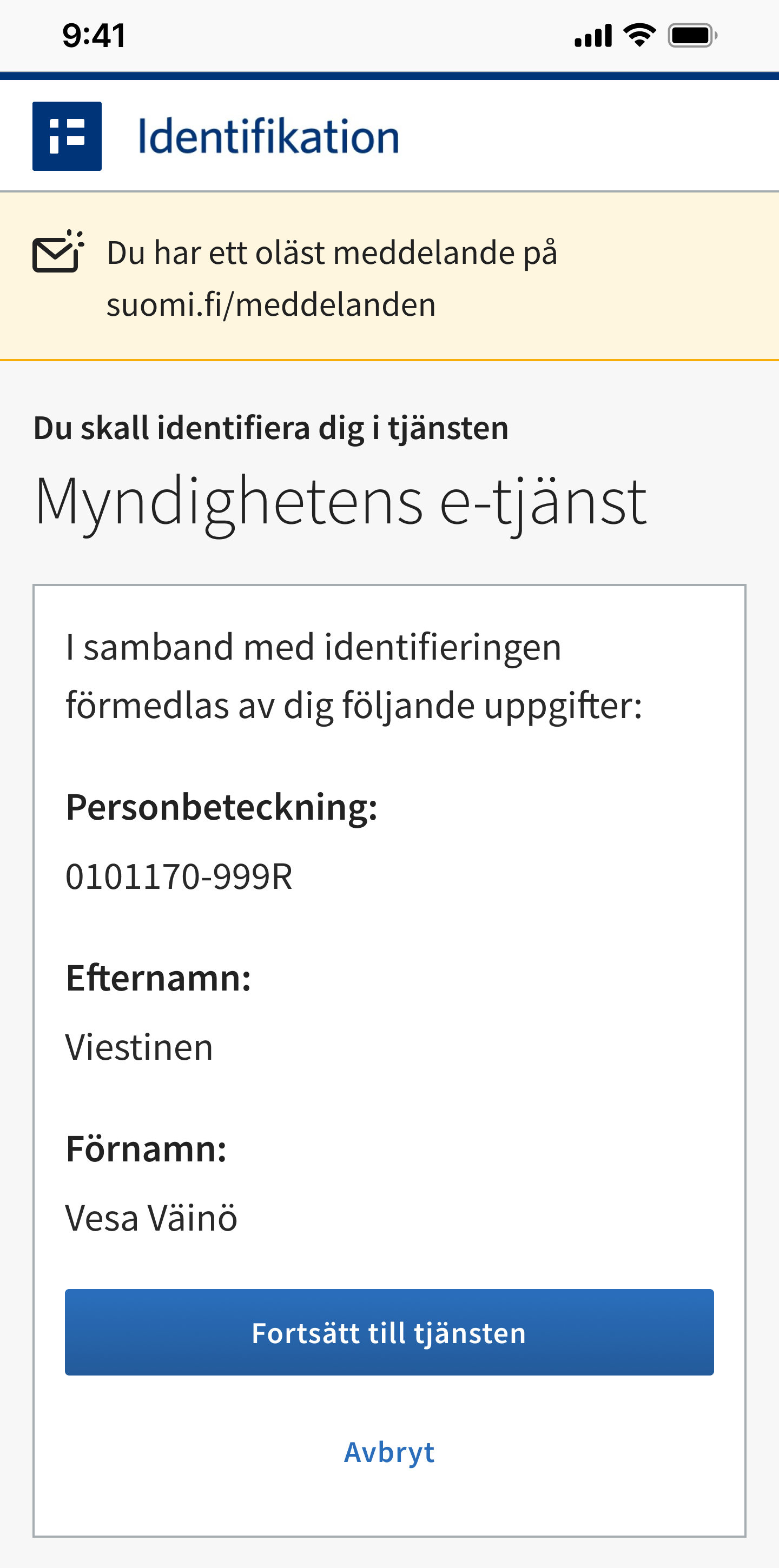 Från och med 2.12.2025 får du en notifikation i samband med Suomi.fi-identifikation om du har ett nytt oläst meddelande i Suomi.fi-meddelanden. Notifikationen visas när du identifierar dig i statens, kommunens eller välfärdsområdets elektroniska tjänster. Ändringen bidrar till att säkerställa att mottagaren säkert ser viktiga myndighetsmeddelanden, såsom beslut, fakturor och tidsbokningsbrev.
