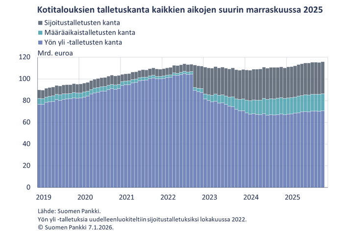 Kotitalouksien talletuskanta kasvoi marraskuussa 2025 vuodentakaisesta 4,3 %, kun marraskuussa 2024 talletuskanta kasvoi 2,8 % vuosikasvuvauhtia. Vuoden 2025 tammi-marraskuussa kotitaloudet kasvattivat nettomääräisesti eniten yön yli -talletuksiaan, yhteensä 3,5 mrd. euroa. Sijoitustalletuksiin kotitaloudet sijoittivat nettomääräisesti vastaavalla ajanjaksolla 1,4 mrd. euroa ja määräaikaistalletuksiin 700 milj. euroa. Uusia määräaikaistalletussopimuksia kotitaloudet tekivät vuoden 2025 marraskuussa 1,2 mrd. euron edestä, mikä oli lähes saman verran kuin vuotta aiemmin vastaavana ajankohtana huolimatta laskeneista koroista. Uusista määräaikaistalletussopimuksista 91 % oli enintään vuoden pituisia ja loput tätä pidempiä.