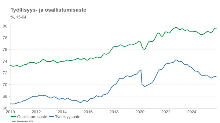 Sen sijaan osallistumisaste on korkealla. Työvoiman ulkopuolella olevia 15–74-vuotiaita oli vuoden 2025 joulukuussa 1 349 000, mikä oli 33 000 vähemmän kuin vuosi sitten.