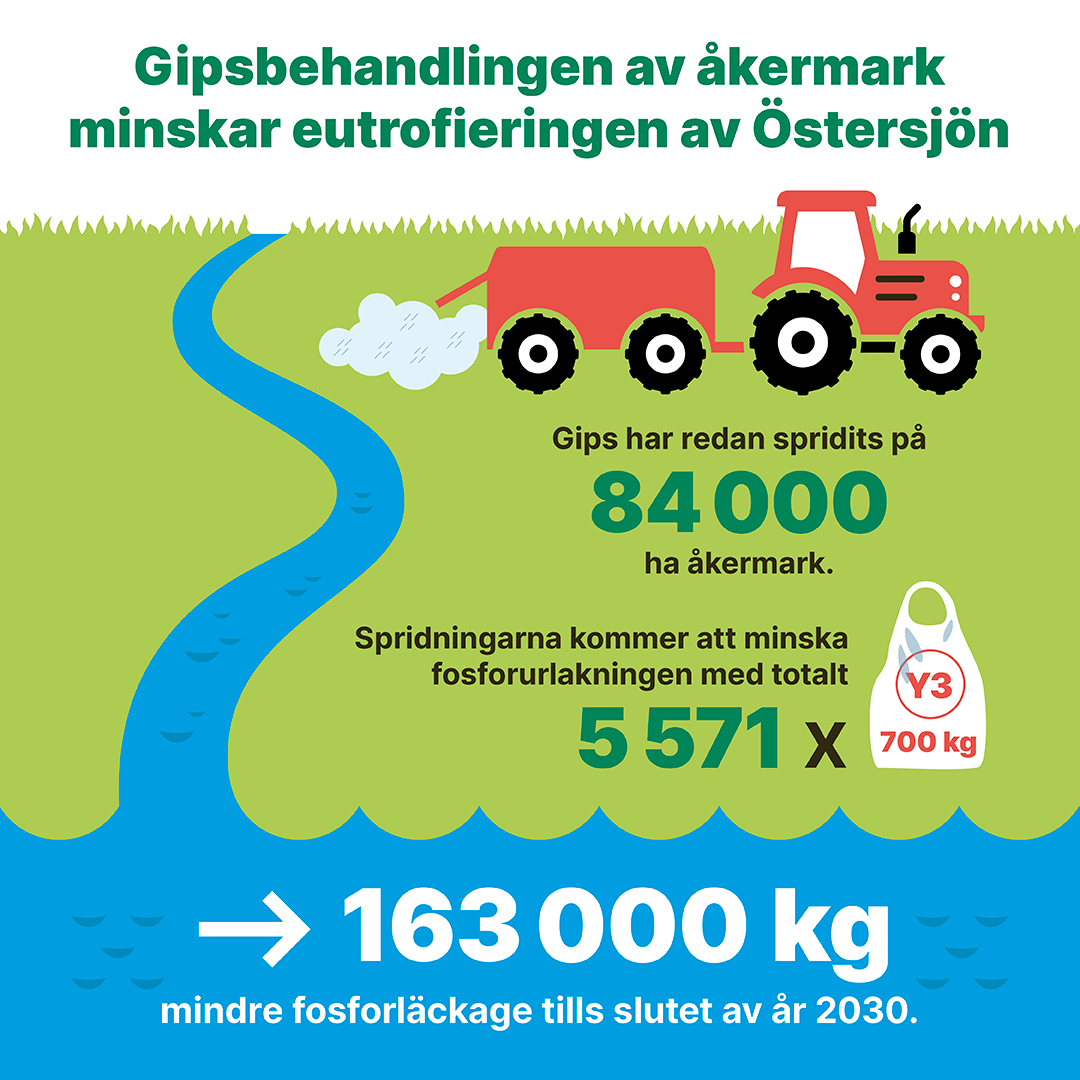 Gips har under de senaste fem åren redan spridits på 84 000 hektar åker. Tack vare spridningen uppskattas utlakning av sammanlagt 117 ton fosfor ha förhindrats. Det motsvarar näringen i ca 5 571 storsäckar om 700 kg, som stannat kvar i åkerjorden för användning av växterna. Effekten på lång sikt är en minskning av fosforbelastningen på Östersjön om uppskattningsvis 163 000 kilogram fram till slutet av 2030.