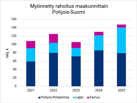 Vuonna 2025 Finnvera myönsi Lapin, Pohjois-Pohjanmaan ja Kainuun alueille yhteensä 148 miljoonaa euroa rahoitusta, kun määrä edellisvuonna vastaavana ajankohtana oli 131 miljoonaa euroa.