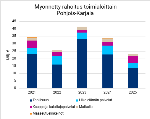 Pohjois-Karjalan alueelle myönnetty rahoitus laski 23 miljoonaan euroon, mikä on 32 prosenttia vähemmän kuin vuonna 2024. Investointien arvo puolittui 51 miljoonasta 27 miljoonaan euroon.