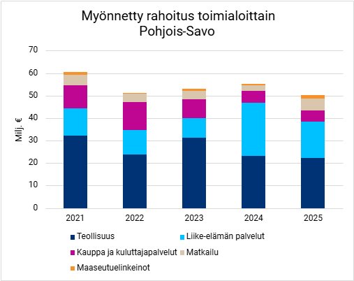 Pohjois-Savon yrityksille myönnettiin rahoitusta 50 miljoonaa euroa vuonna 2025, mikä on 9 prosenttia vähemmän kuin edellisvuonna (55). Investointien arvo nousi kuitenkin selvästi ja oli 48 miljoonaa euroa, kun vastaava summa edellisvuonna oli 31 miljoonaa euroa. Teollisuus pysyi suurimpana rahoituskohteena 22 miljoonalla eurolla, ja matkailun rahoitus kasvoi poikkeuksellisen voimakkaasti.