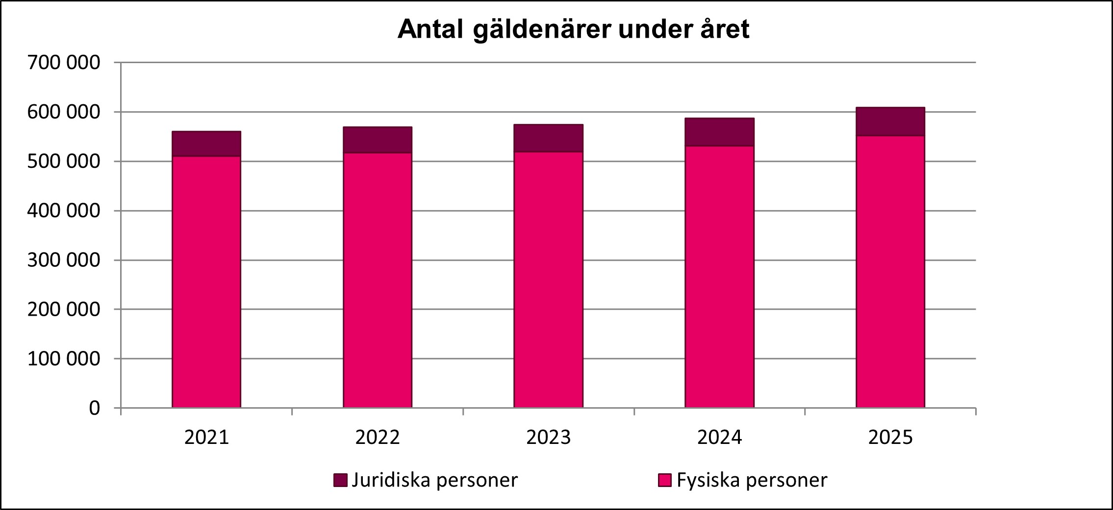 Det sammanlagda antalet utsökningsgäldenärer överskred för första gången gränsen på 600 000 unika gäldenärer 2025. Antalet gäldenärer som var kunder hos utsökningen var sammanlagt drygt 608 000 under fjolåret. Antalet gäldenärer ökade med 3,7 procent jämfört med året innan. Antalet beskriver de fysiska personer och företag som varit gäldenärer i utsökning under samma år. Vid en enskild tidpunkt befinner sig i genomsnitt omkring 269 000 gäldenärer i utsökning samtidigt.