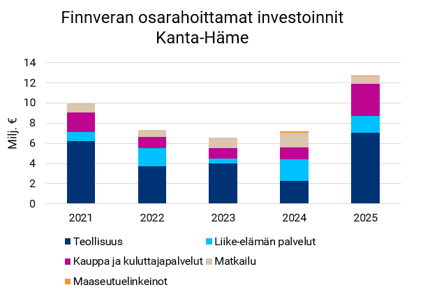 Finnveran myöntämä kokonaisrahoitus Kanta-Hämeeseen laski vuonna 2025 hieman edellisvuodesta 13 miljoonaan euroon (14). Toimialoista kaupan ja kuluttajapalvelujen rahoitus kuitenkin kasvoi noin neljänneksellä.