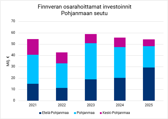 Finnvera myönsi Etelä-Pohjanmaan, Keski-Pohjanmaan ja Pohjanmaan pk‑ ja midcap‑yrityksille rahoitusta yhteensä 105 miljoonaa euroa vuonna 2025, mikä on lähes edellisvuoden tasolla. Finnveran yhdessä muiden rahoittajien kanssa mahdollistamien investointien arvo oli yhteensä noin 54 miljoonaa euroa (56).