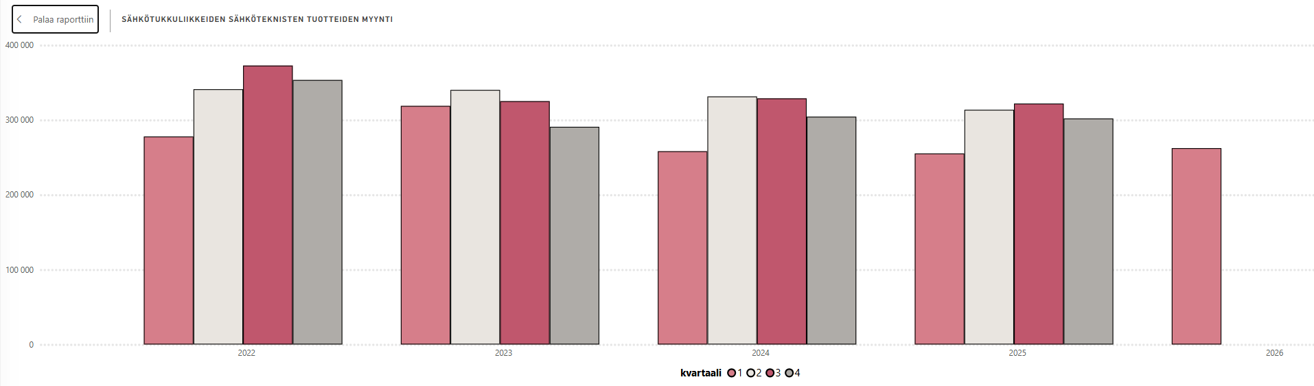 Sähköteknisten tuotteiden tukkumyynti vuonna 2025 oli 1 193 miljoonaa euroa, mikä on 2,5 prosenttia vähemmän kuin edellisvuonna, kertoo tuore Sähköteknisen kaupan liitto ry:n (STK) tilasto. Suunta on varovaisen positiivinen: vuoden viimeisellä neljänneksellä myynti piristyi ja jäi vain 0,8 prosenttia vuotta aiemmista myyntiluvuista.