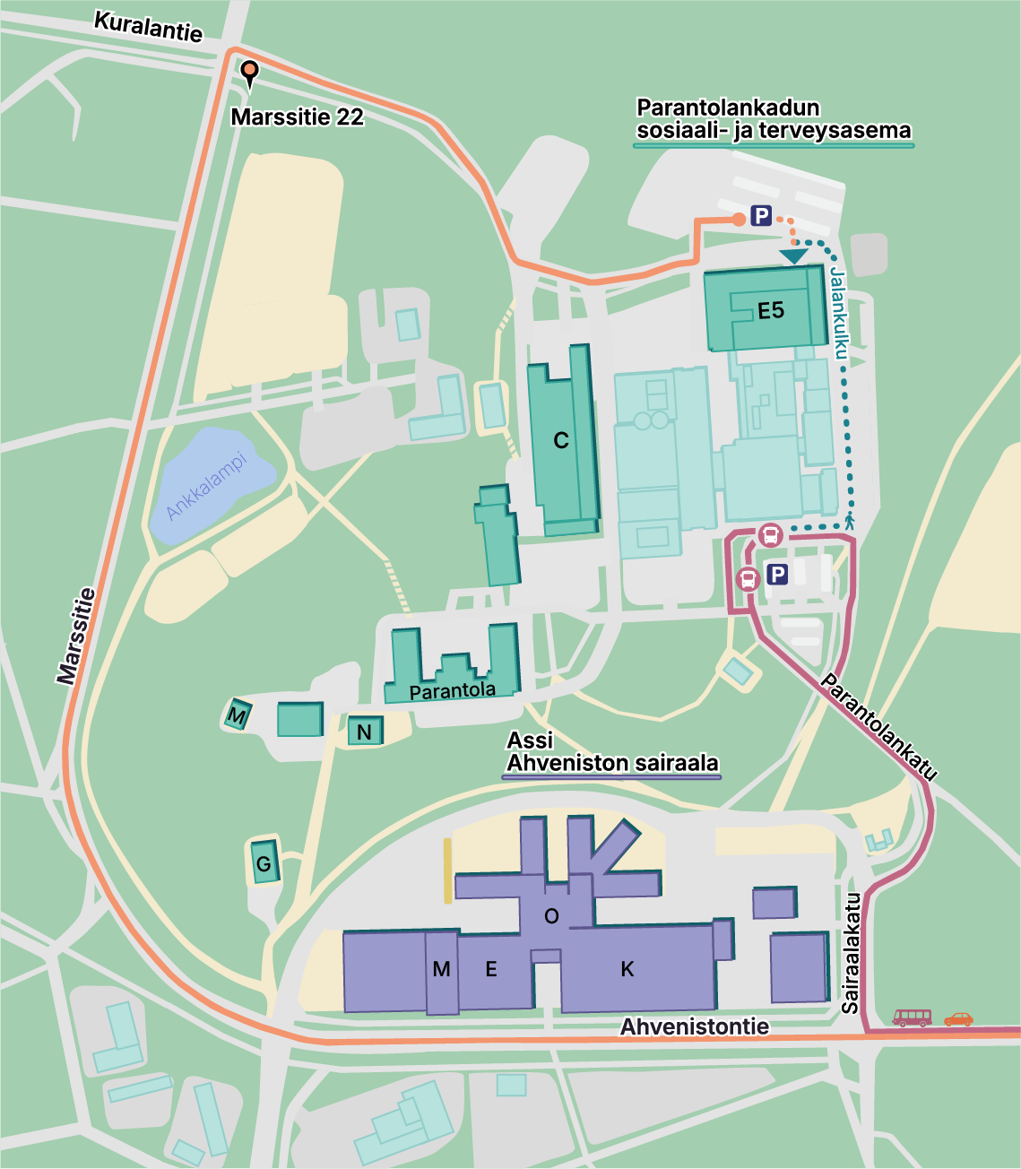 Parantolankadun varressa ovat edelleen käytössä vanhan keskussairaalan pysäköintipaikat, joista pääsee kävellen (sininen katkoviiva kuvassa) toukokuussa avattavalle sote-asemalle.