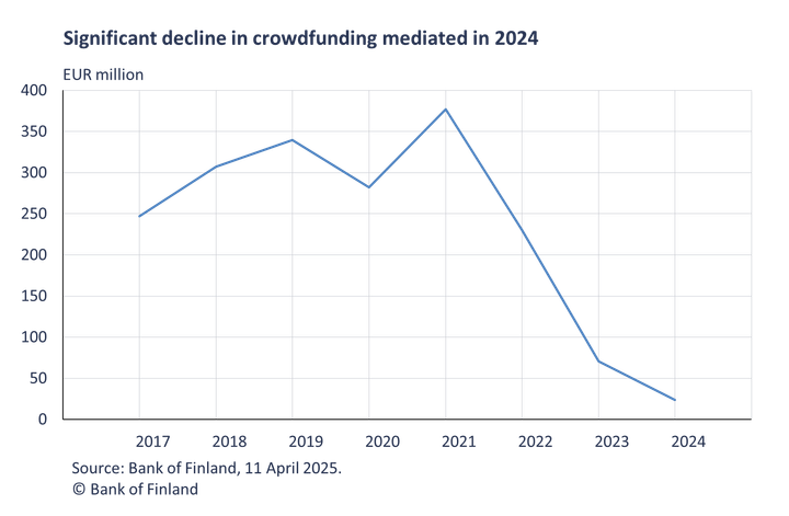 The Crowdfunding Act (734/2016) prepared by the Ministry of Finance entered into force on 1 September 2016, easing the regulation of companies mediating crowdfunding. At the same time, peer-to-peer lending between private individuals became significantly more widespread. The Ministry of Finance collected annual data on the sector in 2013–2016, when crowdfunding grew as a form of corporate finance in Finland. From 2017 onwards, the Bank of Finland began compiling statistics on crowdfunding and peer-to-peer loans. The last statistical data were collected for 2024, directly from the intermediaries of peer-to-peer loans and crowdfunding.