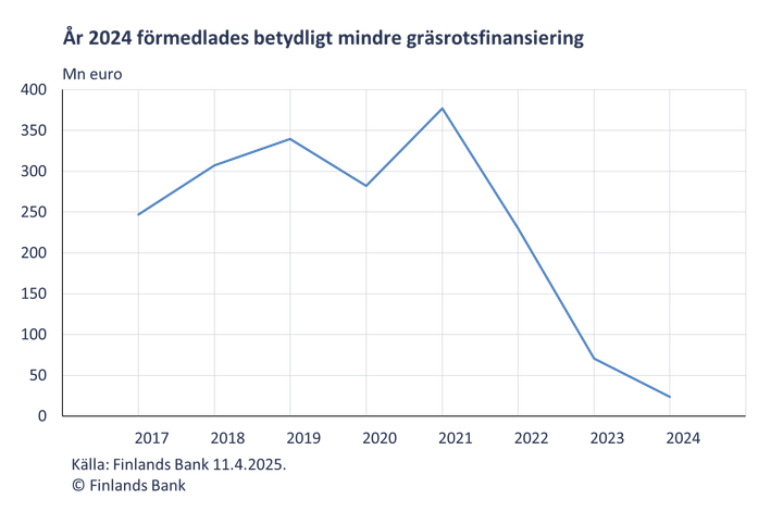 År 2024 förmedlades till inhemska aktörer endast 23,8 miljoner euro i finansiering via plattformar för gräsrotsfinansiering som är registrerade i Finland. Gräsrotsfinansieringen minskade betydligt (66,3 %) jämfört med 2023. Beloppet var det minsta i statistikhistorien (2017–2024). Finlands Banks statistik gav å andra sidan inte en heltäckande bild av marknaden för gräsrotsfinansiering och person-till-person-lån i Finland, eftersom statistiken inte omfattar utländska tjänsteleverantörer som erbjuder tjänster till finländare. Finlands Banks direktion beslutade att avsluta datainsamlingen, eftersom andelen för gräsrotsfinansiering och person-till-person-lån minskade och blev marginell på den inhemska finansmarknaden.