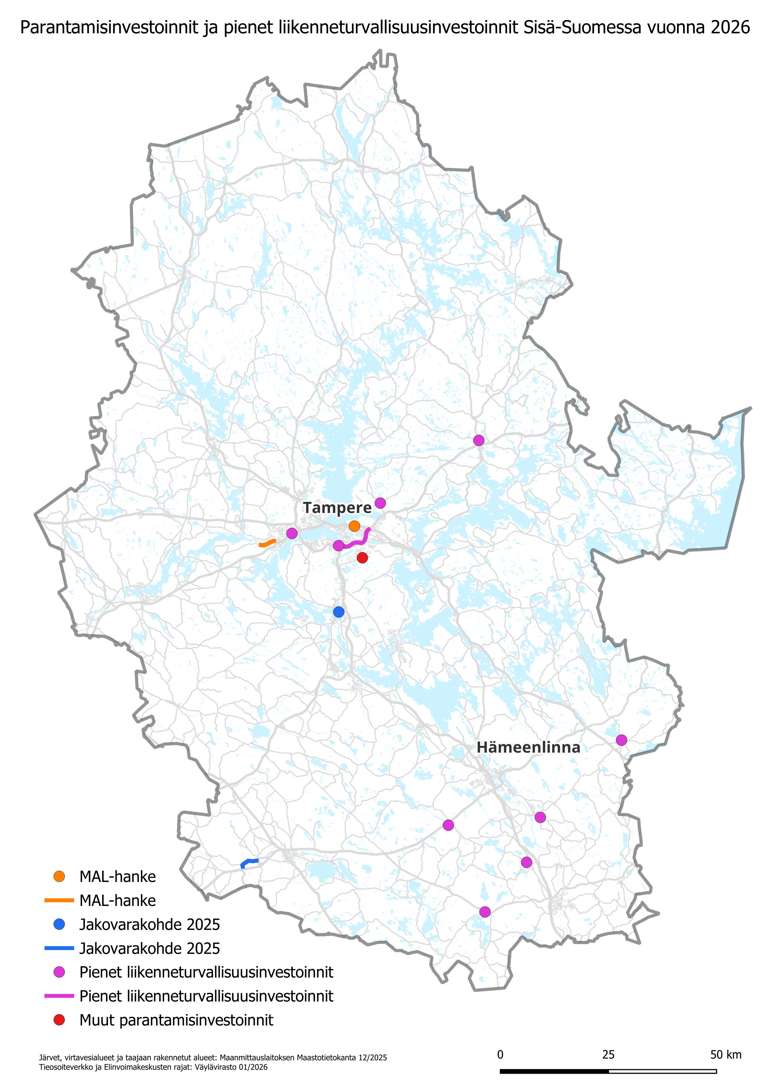 Parantamisinvestoinnit ja pienet liikenneturvallisuusinvestoinnit Sisä-Suomessa vuonna 2026.