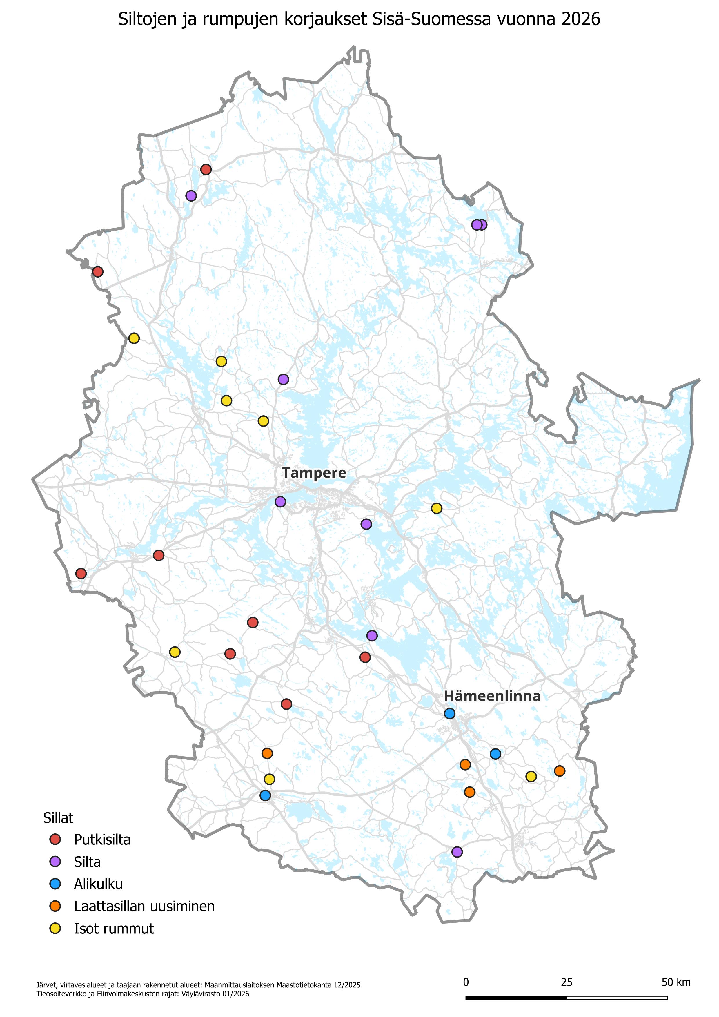 Siltojen ja rumpujen korjaukset Sisä-Suomessa vuonna 2026.