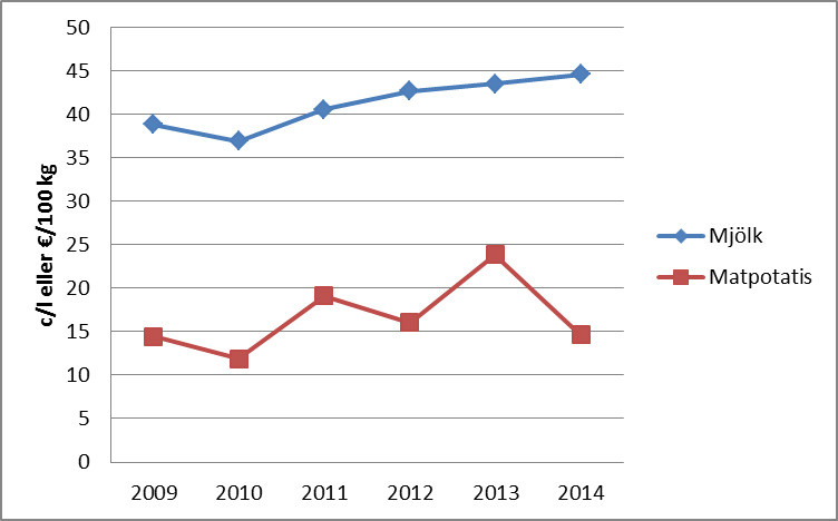 Det genomsnittliga producentpriset på mjölk på årsnivå har stigit sedan 2010. I fjol var producentpriset på mjölk 44,55 cent per liter, vilket var två procent högre än året innan. Siffran innehåller inte tillskott eller mjölkproduktionsstöd. På månadsnivå var priset på mjölk under den första hälften av 2014 högre än under de föregående åren, men sjönk under den senare hälften av 2014 till samma nivå som 2012.