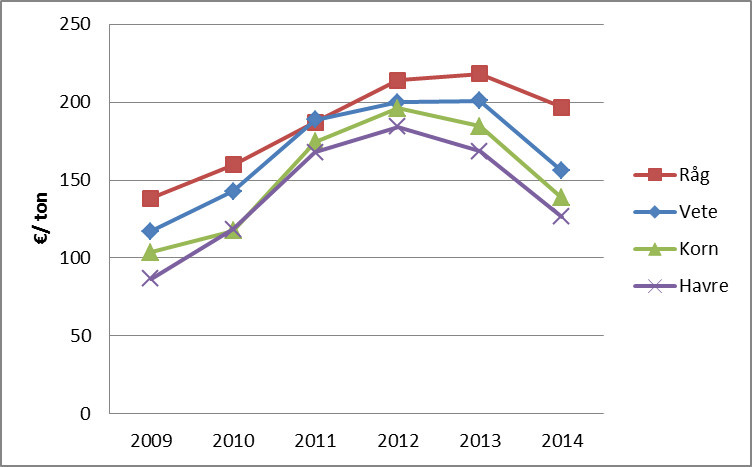 År 2014 fick producenten i genomsnitt 167 euro per tusen kilo brödvete av baskvalitet och 142 euro per tusen kilo fodervete. Priset på brödvete var 17 procent längre och priset på fodervete 30 procent lägre än året innan. Medelpriset på maltkorn var 159, foderkorn 133 och havre 126 euro per tusen kilo. Alla priser var cirka en fjärdedel lägre än året innan. Producentpriset på råg var 197 euro per tusen kilo.