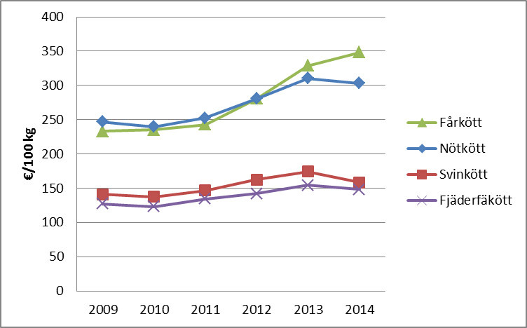 År 2014 fick producenten i genomsnitt 303 euro per hundra kilo nötkött, vilket var två procent mindre än året innan. För köttsvin betalades nio procent mindre än 2013, dvs. 162 euro per hundra kilo. Även producentpriset på broilerkött sjönk med nästan fyra procent till 146 euro per hundra kilo. För lammkött fick producenten däremot 401 euro per hundra kilo, dvs. nästan tre procent mer än året innan.