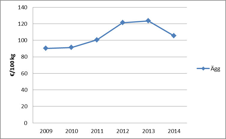 Det genomsnittliga producentpriset på ägg i klass A var 105 euro per hundra kilo år 2014. Priset sjönk med 15 procent från året innan.