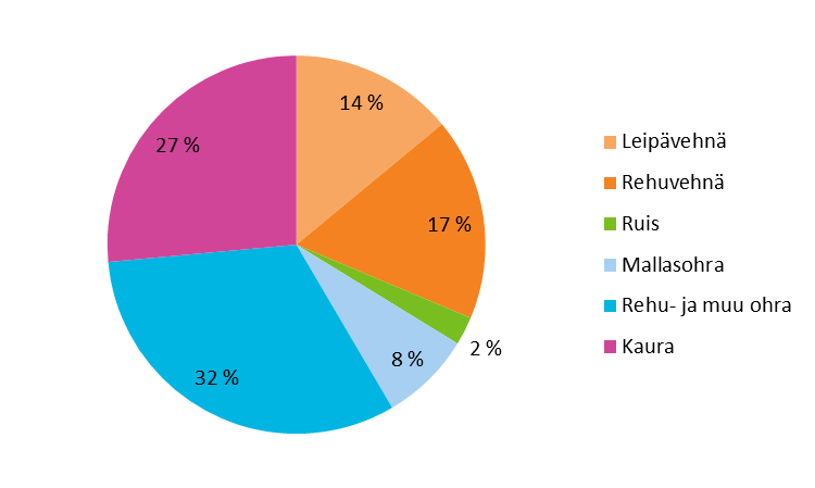 Maatilojen teollisuuteen tai välittäjille myymästä viljasta 40 prosenttia oli viime satovuoden aikana ohraa, 31 prosenttia vehnää, 26 prosenttia kauraa ja kaksi prosenttia ruista. Rypsiä ja rapsia tuli markkinoille yhteensä 44 miljoonaa kiloa.