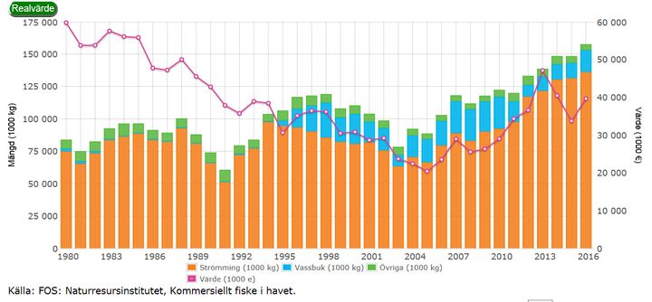 I fjol fiskades 136 miljoner kilo strömming och 17 miljoner kilo vassbuk. Fångsten av bägge arter ökade med ca 5 miljoner kilo från året innan.