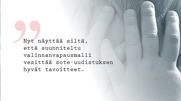 Valinnanvapaus sinällään on hyvä ja kannatettava asia. Se, että valinnanvapaus kirjataan lain nimeen, ei vielä tarkoita sitä, että potilailla ja asiakkailla olisi käytännössä mahdollisuus käyttää valinnanvapautta palveluissa. Valinnanvapausmalli sopii yksittäisiin ja selkeisiin hoitotoimenpiteisiin. Hyvässä asemassa oleville perheille valinnanvapaus voi luoda lisää mahdollisuuksia valita palveluita. Se sopii kuitenkin huonosti tilanteisiin, jotka vaativat moniammatillista työskentelyä ja pitkäkestoista sosiaali- ja terveydenhuollon asiakkuutta. Etenkin heikommassa asemassa olevien perheiden tilanne uhkaa huonontua. Miten toimivista palveluketjuista ja -kokonaisuuksista vastataan esimerkiksi lastensuojelu-, mielenterveys-, vammais- tai päihdepalveluiden asiakkaana olevien perheiden kohdalla?