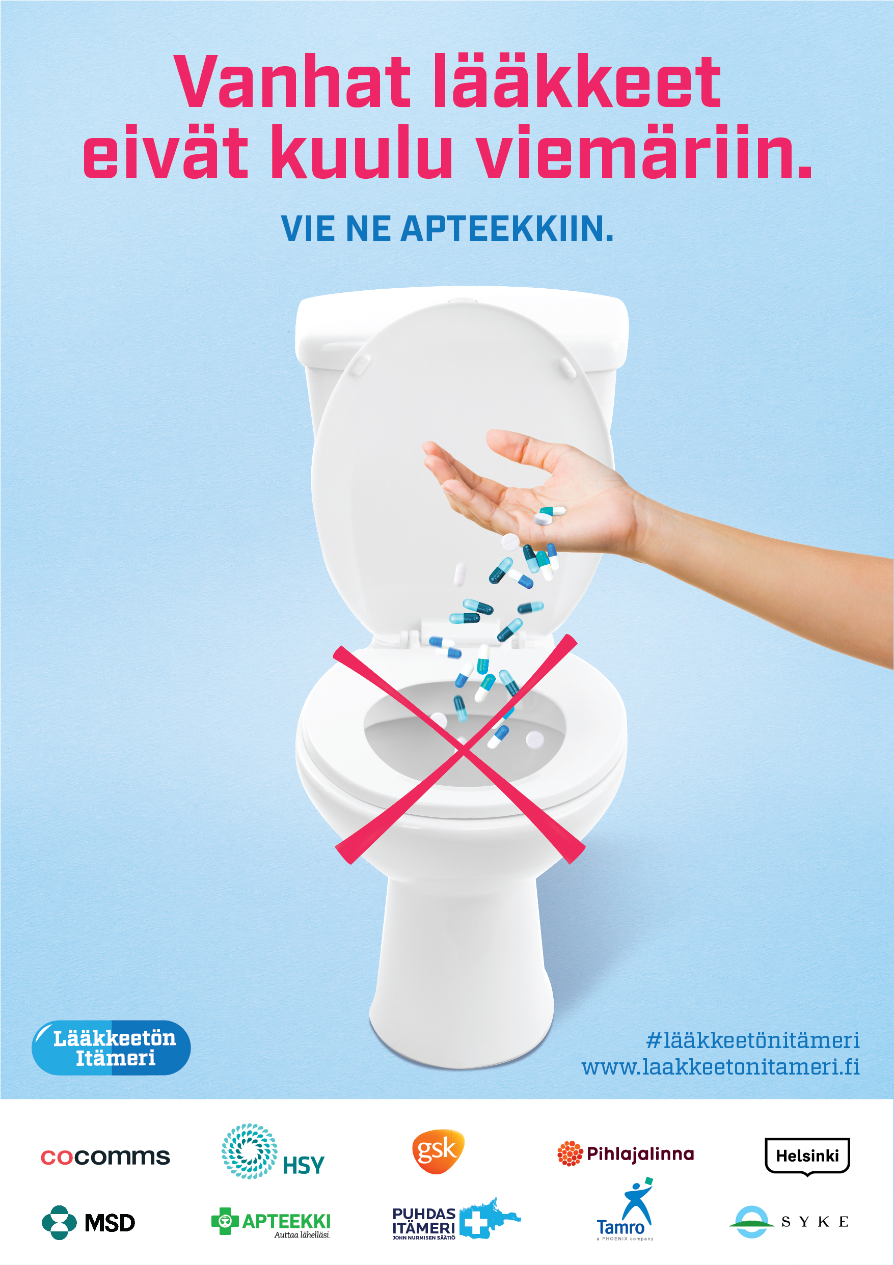 Kampanjan toteuttaa viestintätoimisto Cocomms ja sen ovat mahdollistaneet Helsingin kaupunki, HSY, Apteekkariliitto, Pihlajalinna, Tamro sekä lääkeyhtiöt MSD ja GSK. Kampanjan asiantuntijana toimii Suomen Ympäristökeskus SYKE ja suojelijana John Nurmisen Säätiö.