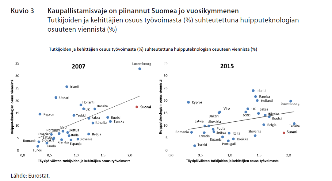 Etlan tutkija Annu Kotiranta ja tutkimuspäällikkö Antti Tahvanainen listaavat Suomen samaan kastiin Slovenian, Espanjan, Romanian, Kroatian, Italian ja Liettuan kanssa. Tutkijat vertasivat tutkijoiden ja kehittäjien osuutta työvoimasta suhteutettuna huipputeknologian osuuteen viennistä (Kuvio 3 alla).