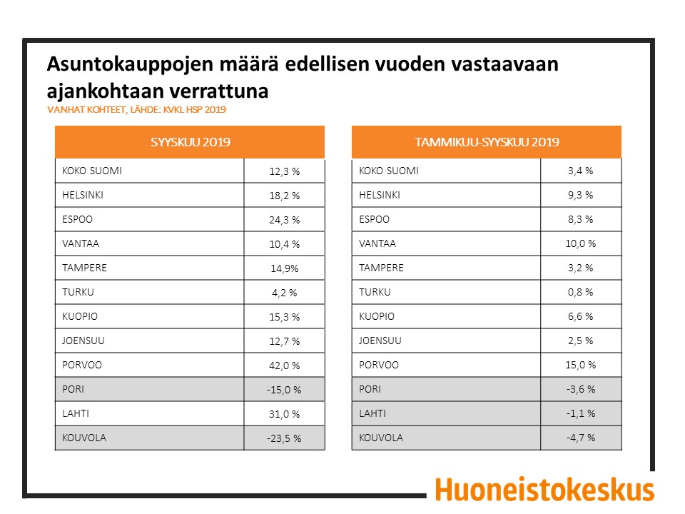 Kumulatiivisesti vanhojen asuntojen kauppoja on tehty Suomessa kuluvan vuoden tammi–syyskuussa 3,4 % enemmän kuin vastaavana ajanjaksona viime vuonna. Vanhojen asuntojen kauppamäärät ovat tähän mennessä vuotta kasvaneet suhteellisesti voimakkaimmin Porvoossa (+15 %), Vantaalla (+10 %), Helsingissä (+9,3 %) ja Espoossa (+8,3 %). Kumulatiivisesti vanhojen asuntojen kauppamäärät ovat laskeneet tammi–syyskuussa eniten Kouvolassa (-4,7 %), Porissa (-3,6 %) ja Lahdessa (-1,1 %).