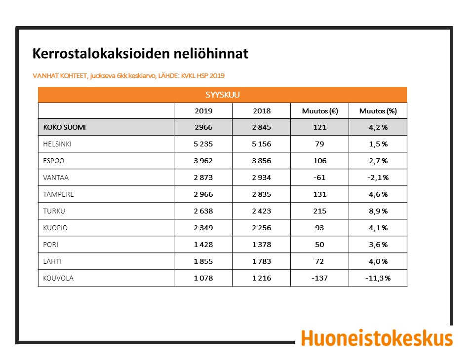 *Vanhat asunnot sisältävät kaikki vanhat kerrostalo-, rivitalo- ja omakotitaloasunnot, mutta eivät tontteja, autotalleja tai loma-asuntoja. Luvut perustuvat KVKL:n ylläpitämään Hintaseurantapalveluun, johon suurimmat välitysliikkeet toimittavat kauppatietonsa. Tiedot on noudettu palvelusta 18.10.2019.