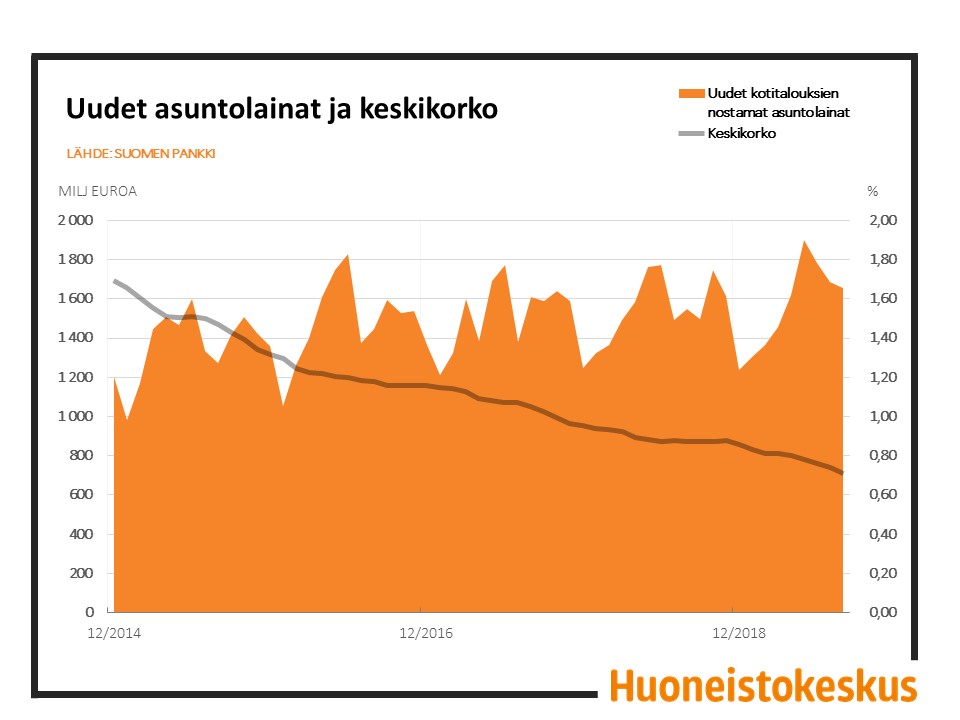 Kotitaloudet nostivat elokuussa 2019 uusia asuntolainoja 1,7 mrd. euron edestä, mikä on hieman enemmän kuin vuosi sitten vastaavana ajankohtana. Uusien nostettujen asuntolainojen keskikorko oli 0,71 %. Euromääräisten asuntolainojen kanta oli toukokuun 2019 lopussa 99,4 mrd. euroa ja asuntolainakannan vuosikasvu 2,3 %. (Lähde: Suomen Pankki)