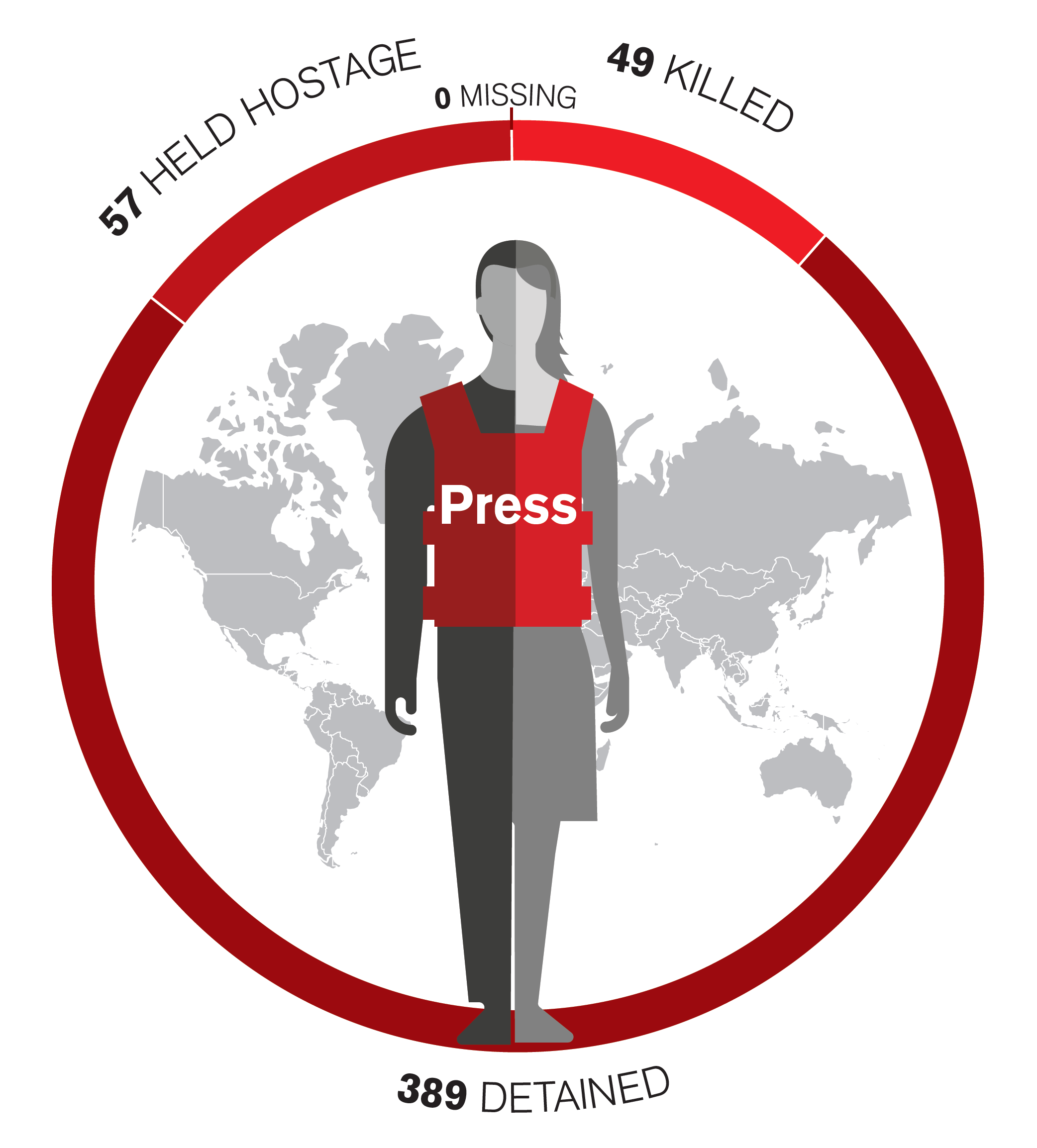 “Ero sotaa käyvien ja rauhantilassa olevien maiden välillä on toimittajien turvallisuuden kannalta häviämässä”, arvioi kansainvälisen Toimittajat ilman rajoja -järjestön pääsihteeri Christophe Deloire.