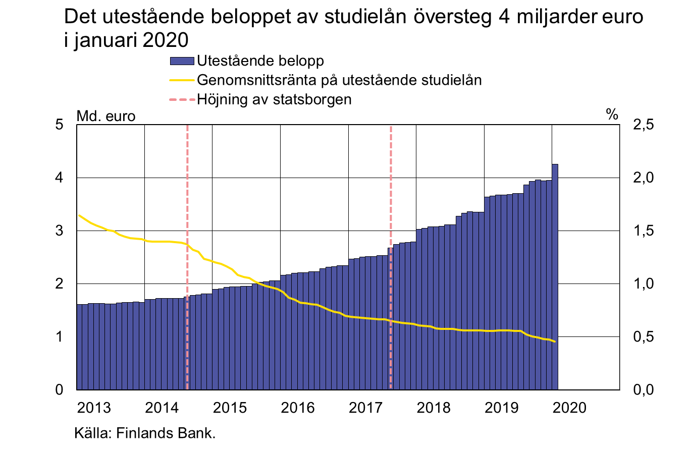 I januari 2020 utbetalades studielån för 308 miljoner euro, vilket är 8 % mer än vid motsvarande tidpunkt för ett år sedan och mer än någonsin under en månad. Genomsnittsräntan på nya uttag av studielån var i januari 2020 rekordlåg (0,34 %), när räntan på nya utbetalda studielån under samma period ett år tidigare var 0,48 %. Av de nya lånen var 90 % bundna till euriborräntor och 10 % till bankernas egna referensräntor. Genomsnittsräntan på euriborbundna studielån var 0,27 % och på primräntebundna studielån 0,88 %.