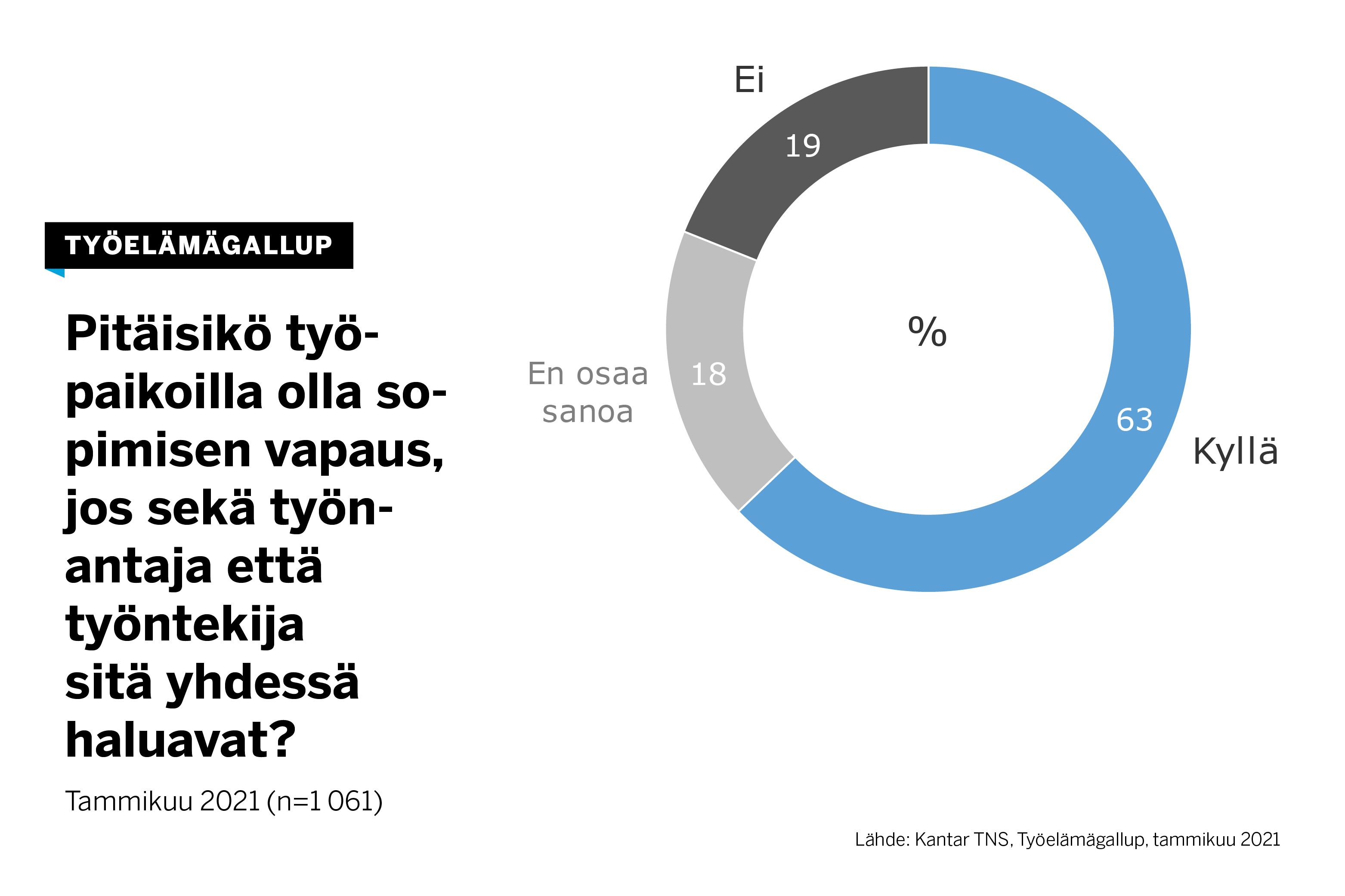 63 prosenttia vastaajista haluaa, että työehdoista pitäisi voida sopia työpaikalla, jos sekä työntekijät että työnantaja niin haluavat. 19 prosenttia vastaajista on eri mieltä. 18 prosenttia ei osaa arvioida asiaa.