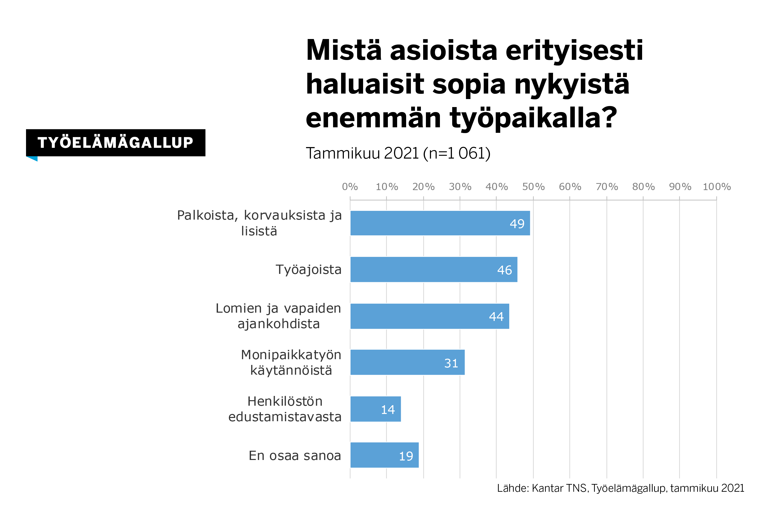 Työelämässä olevat haluaisivat sopia työpaikoilla palkoista, korvauksista ja lisistä (49 %), työajoista (46 %), sekä lomien ja vapaiden ajankohdista (44 %) enemmän kuin nyt. Lähes kolmannes (31 %) haluaisi sopia monipaikkatyön käytännöistä.