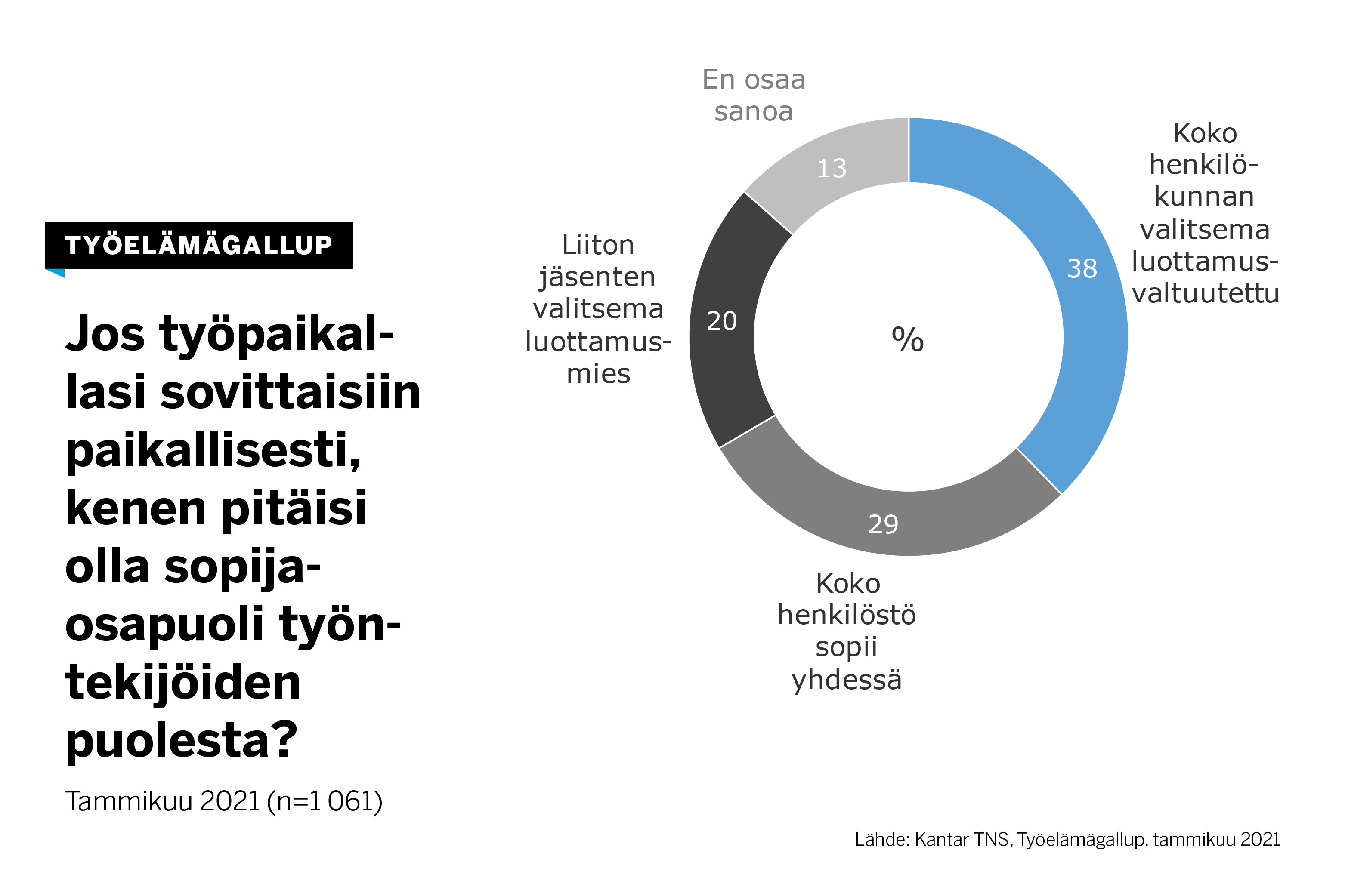 Jos työpaikalla sovittaisiin paikallisesti, suosituin työllisten puolesta sopija on koko henkilökunnan valitsema luottamusvaltuutettu (38 %). Toiseksi suosituin vaihtoehto olisi, että koko henkilöstö olisi yhdessä sopimassa (29 %). Liiton jäsenten valitsemaa luottamusmiestä kannattaisi 20 prosenttia työllisistä.