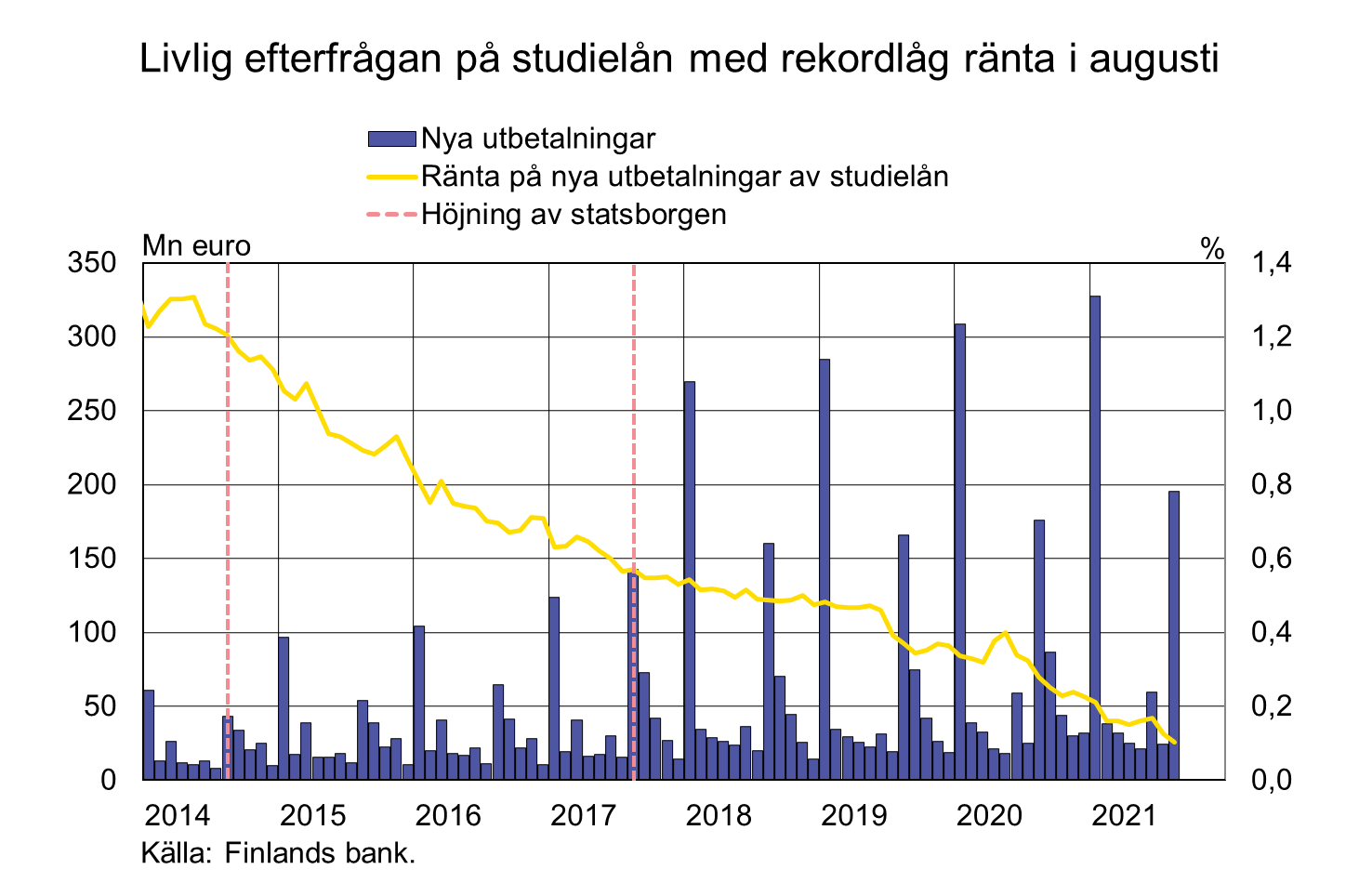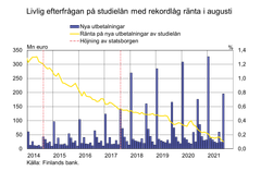 I augusti 2021 utbetalades studielån för 196 miljoner euro, vilket är 20 miljoner mer än vid motsvarande tidpunkt för ett år sedan. Genomsnittsräntan på nya studielån var rekordlåg (0,10 %). I och med statsborgen är studielånen för bankerna lån med låg risk, vilket också återspeglas i små marginaler på studielånen. Utöver marginalen inverkar lånets referensränta på studielånens räntenivå. Av de utbetalda lånen i augusti var 95 % bundna till euribor[1] och genomsnittsräntan på dem var 0,06 %. Genomsnittsräntan på nya studielån som bundits till bankernas egna referensräntor var klart högre (0,84 %).