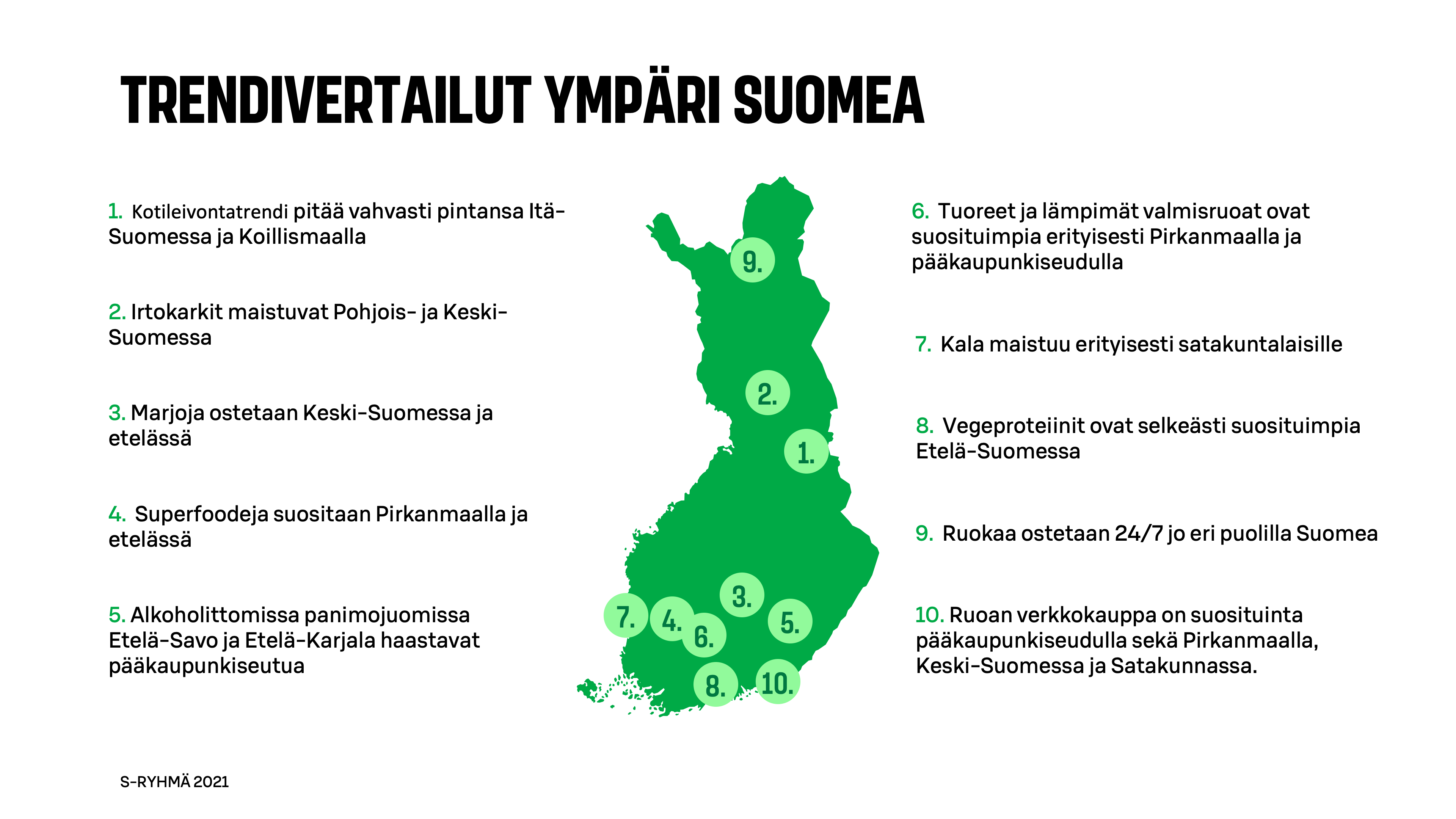Suomalaiset ovat innostuneet käyttämään ruoanlaitossa tuoretta kalaa (+27 %), joista lohi säilyttää kärkipaikkansa suosikkina. Eniten kalaa syötiin Satakunnan alueella S-ryhmän keskiarvoon verrattuna. Sushin myynti ruokakaupassa on kirjaimellisesti räjähtänyt (+1 853 %). S-ryhmän myymälöihin ympäri Suomen on viimeisen kahden vuoden aikana avattu lähes 100 uutta sushin myyntipistettä. Korona-aikana myös ravintoloiden sulkeminen osaltaan lisäsi sushin ostamista kaupasta.