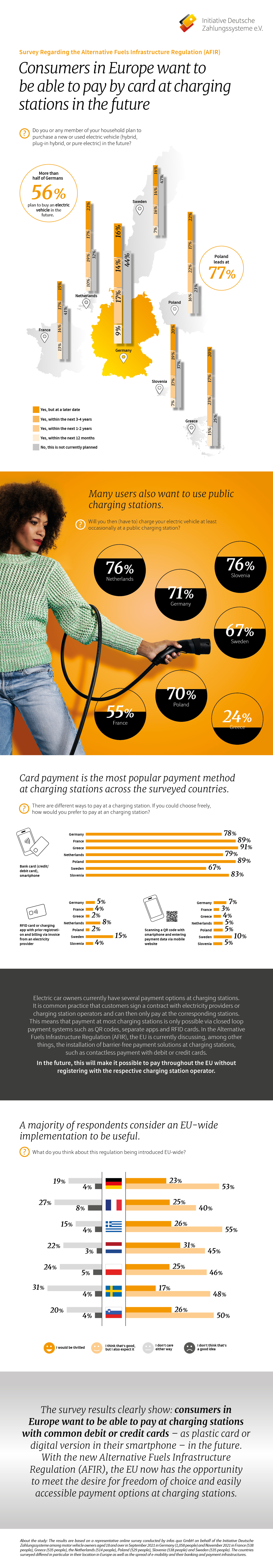 The survey results clearly show: consumers in Europe want to be able to pay at charging stations with common debit or credit cards – as plastic card or digital version in their smartphone – in the future. With the new Alternative Fuels Infrastructure Regulation (AFIR), the EU now has the opportunity to meet the desire for freedom of choice and easily accessible payment options at charging stations.