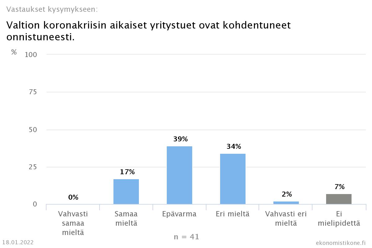 Vain 17 prosenttia Ekonomistipaneelin vastaajista arvioi, että valtion koronakriisin aikaiset yritystuet ovat kohdentuneet onnistuneesti. Eri mieltä on 36 prosenttia ja kannastaan epävarmoja vielä enemmän, 39 prosenttia. Kriisin alkuvaiheen kehittämisavustukset kohdentuivat kehnosti, mutta koronatukien osumatarkkuus parani kustannustuen käyttöönoton myötä, toteavat ekonomistit kommenteissaan. Koronakriisin pitkittyessä tukien kohdentamista olisi pitänyt kyetä parantamaan, lisää moni.