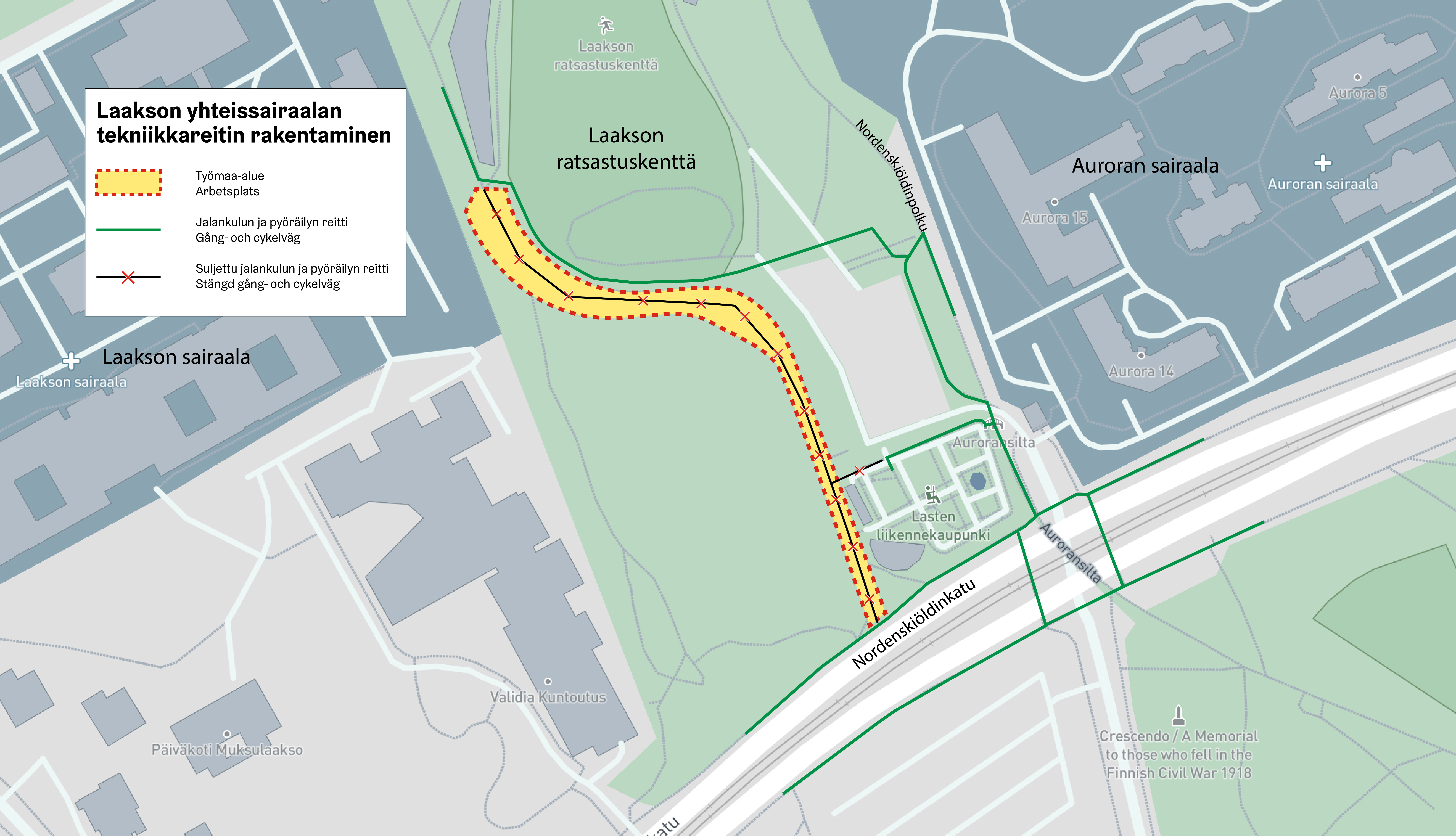 Alkavat työt eivät aiheuta muutoksia Laakson ratsastuskentän itäpuolen reitteihin eikä Auroransillan liikenteeseen.