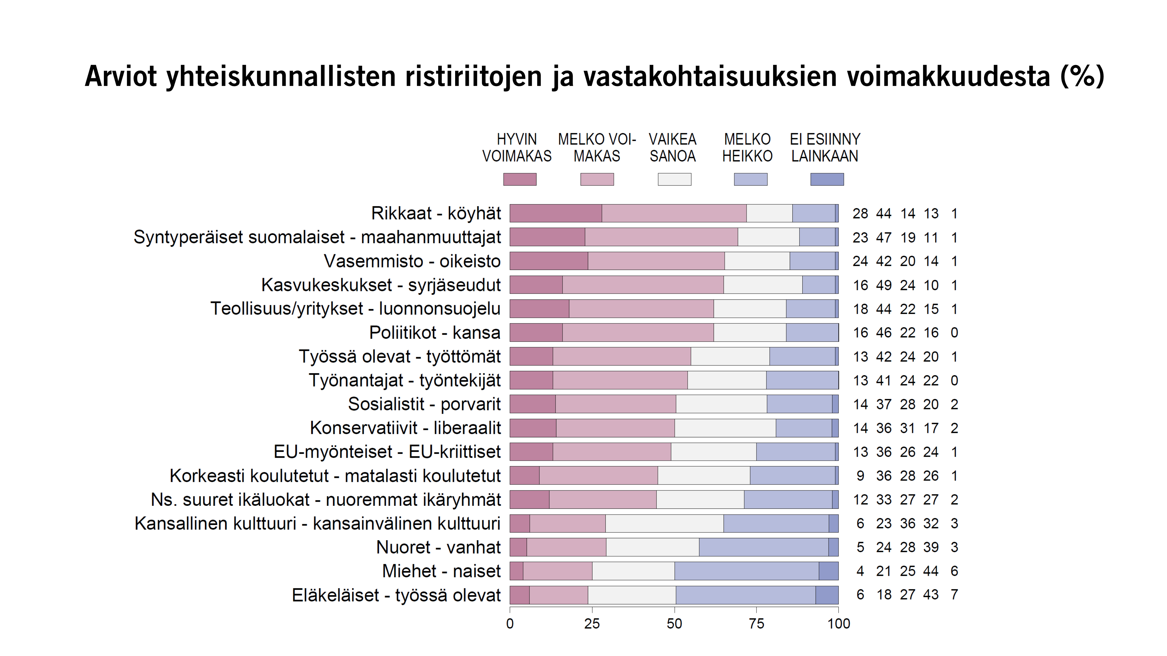 Vasemmiston ja oikeiston vastakkainasettelu nähdään merkittävästi jyrkempinä kuin aiempina vuosikymmeninä. Myös naisten ja miesten sekä nuorten ja vanhojen väliset jännitteet koetaan nyt entistä vahvemmiksi.