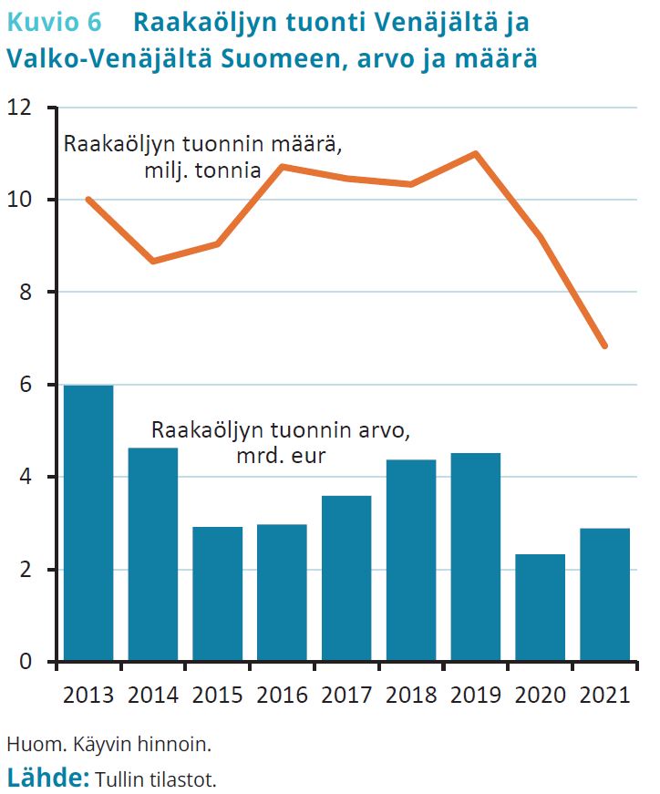 Tuonnin kautta Venäjän merkitys Suomelle on suurempi. Tuonti Venäjältä on nykyisin noin tuplasti suurempaa kuin vienti, joten tuonnin voimakas vähentyminen voisi aiheuttaa vakaviakin ongelmia Suomen talouteen. Vaikutusten suuruus riippuisi siitä, missä määrin yritykset pystyisivät löytämään korvaavia hankintakanavia.