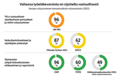 Telassa on ensimmäistä kertaa koottu työeläkealan vastuullisen sijoittamisen tietoja. Työeläkevakuuttajat sijoittavat yhteensä 255 miljardin euron varallisuutta (varojen määrä vuoden 2021 lopussa). Analyysi tarkastelee varojen sitoutumista merkittävimpiin kansainvälisiin vastuullisuussitoumuksiin. Tarkasteluun valitut sitoumukset ja hankkeet valottavat vastuullisen sijoittamisen periaatteita ja toteutusta eri suunnista. Luvut kertovat, kuinka suuri osa työeläkevaroista on sijoitettu kunkin mittarin mukaan.