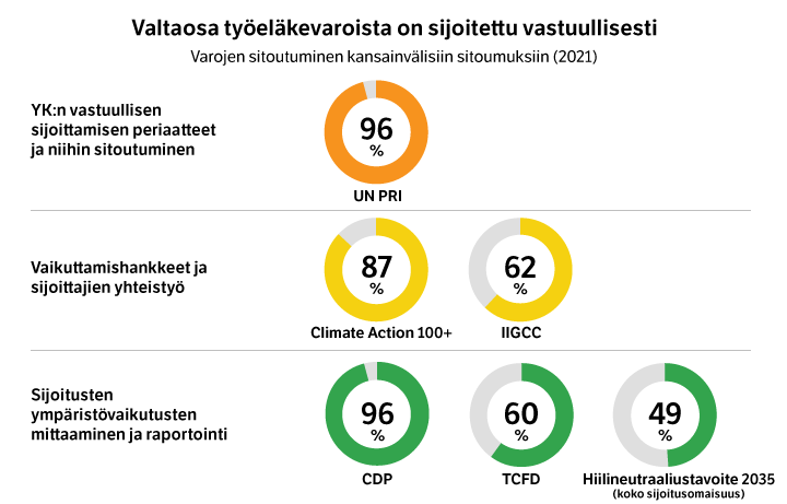 Vähintään 87 prosenttia eläkevaroista kuuluu Climate Action 100+ -aloitteen piiriin. 62 prosenttia varoista kuuluu toisen ilmastonmuutosta vastaan taistelevan, kansainvälisten instituutiosijoittajien yhteistyöelimen piiriin (Institutional Investors Group on Climate Change). Lisäksi osa varoista on mukana näissä sitoumuksissa sijoitustoiminnassa käytettyjen ulkoisten varainhoitajien kautta.